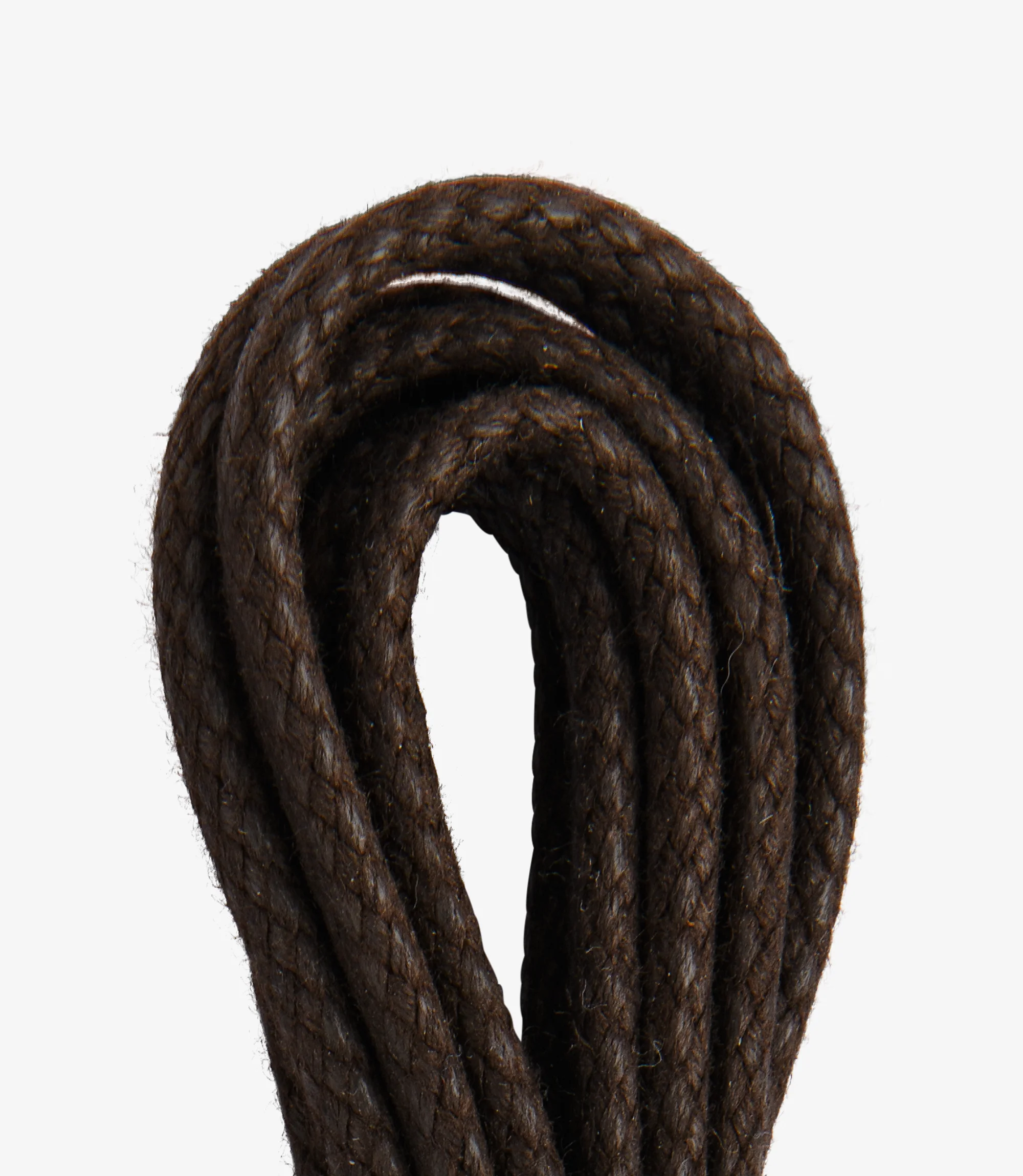 115cm thicker corded laces designed for our lace-up boot styles, offering a robust, traditional look with durable performance and secure fastening for everyday wear. Finished in brown. Made in Spain from a blend of cotton and polyester, waxed and polished for added durability.