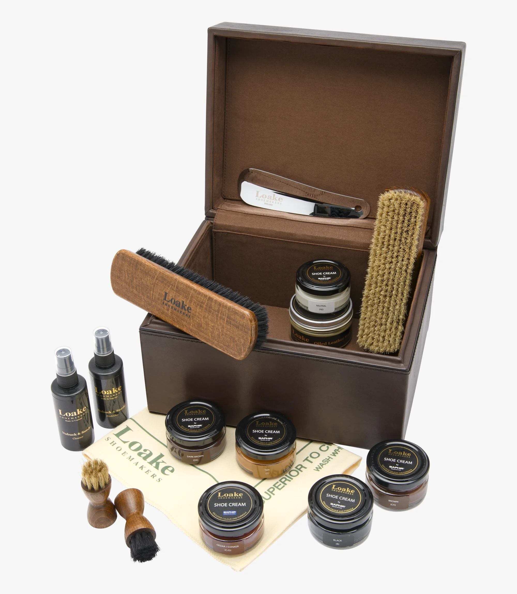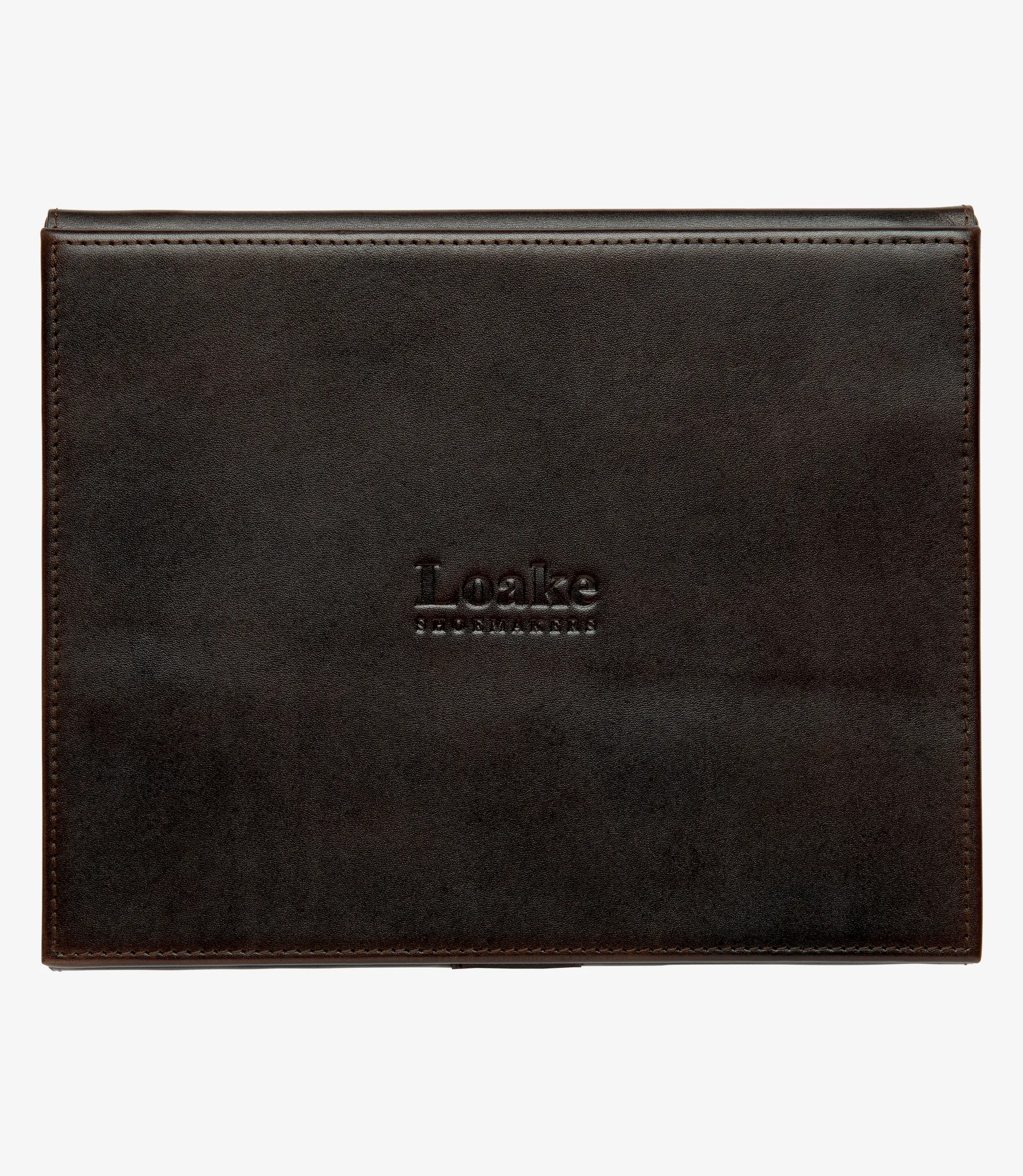 Crafted from premium calf leather, the Loake Dark Brown Large Luxury Valet Box is designed and engineered in Kettering, Northamptonshire, and handmade in our high-grade factory in India. This comprehensive shoe care kit includes a cleaning cloth, metal shoe horn, oiled/waxy leather protector, suede cleaner, and suede protector. It also features six Saphir/Loake shoe creams in Black, Brown, Dark Brown, Conker Brown, Tan, and Neutral, alongside two large polishing brushes and two small applicator brushes. With generous dimensions of 27.5cm x 21.5cm x 16.5cm, this valet box offers everything needed to maintain your footwear’s pristine condition.