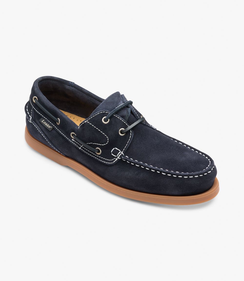 Lace up boat shoe, featuring a Moccasin rubber sole. Lymington is available in Brown ‘Crazy Horse’ leather and Navy Suede. Lymington is made in the EU.