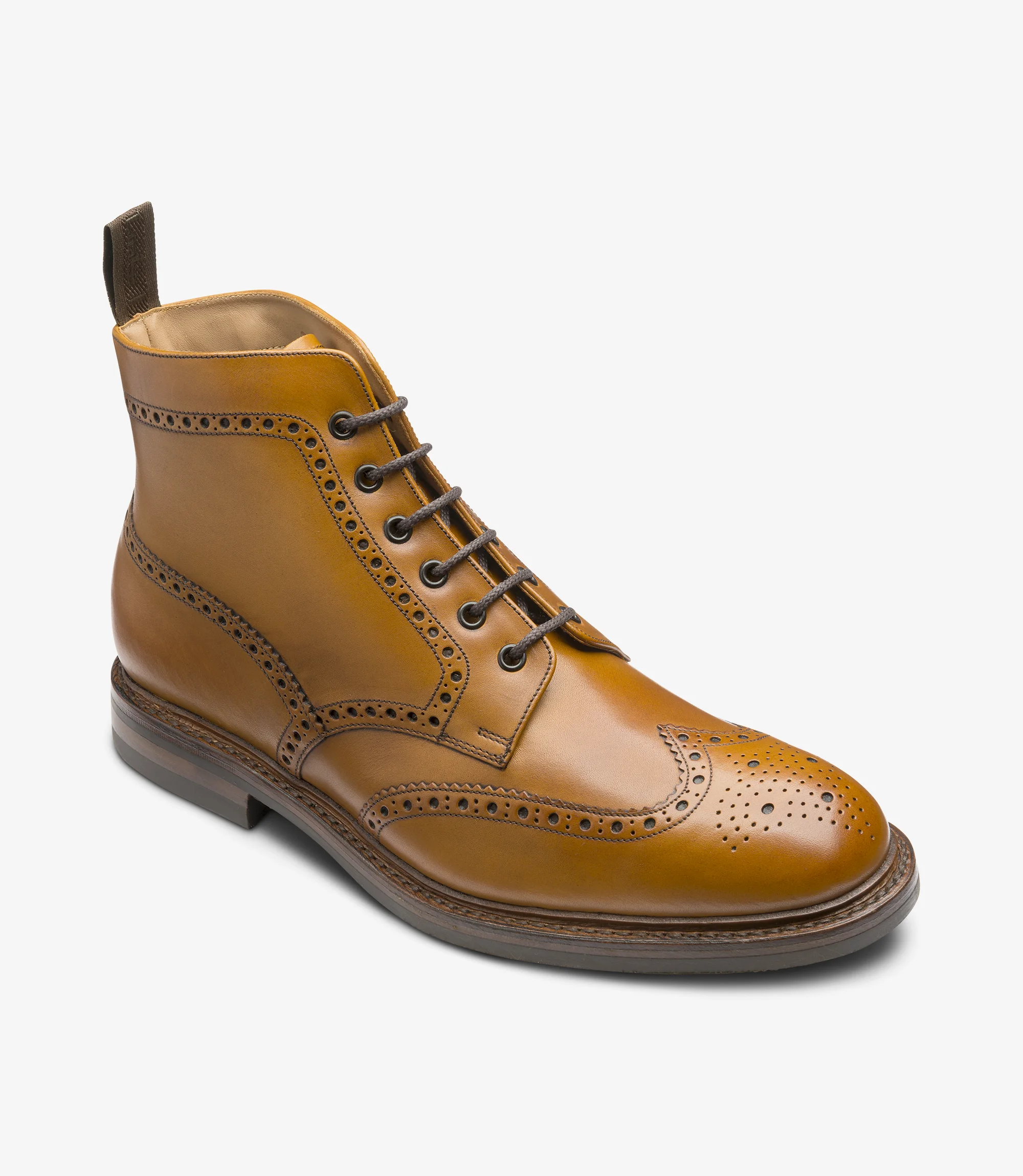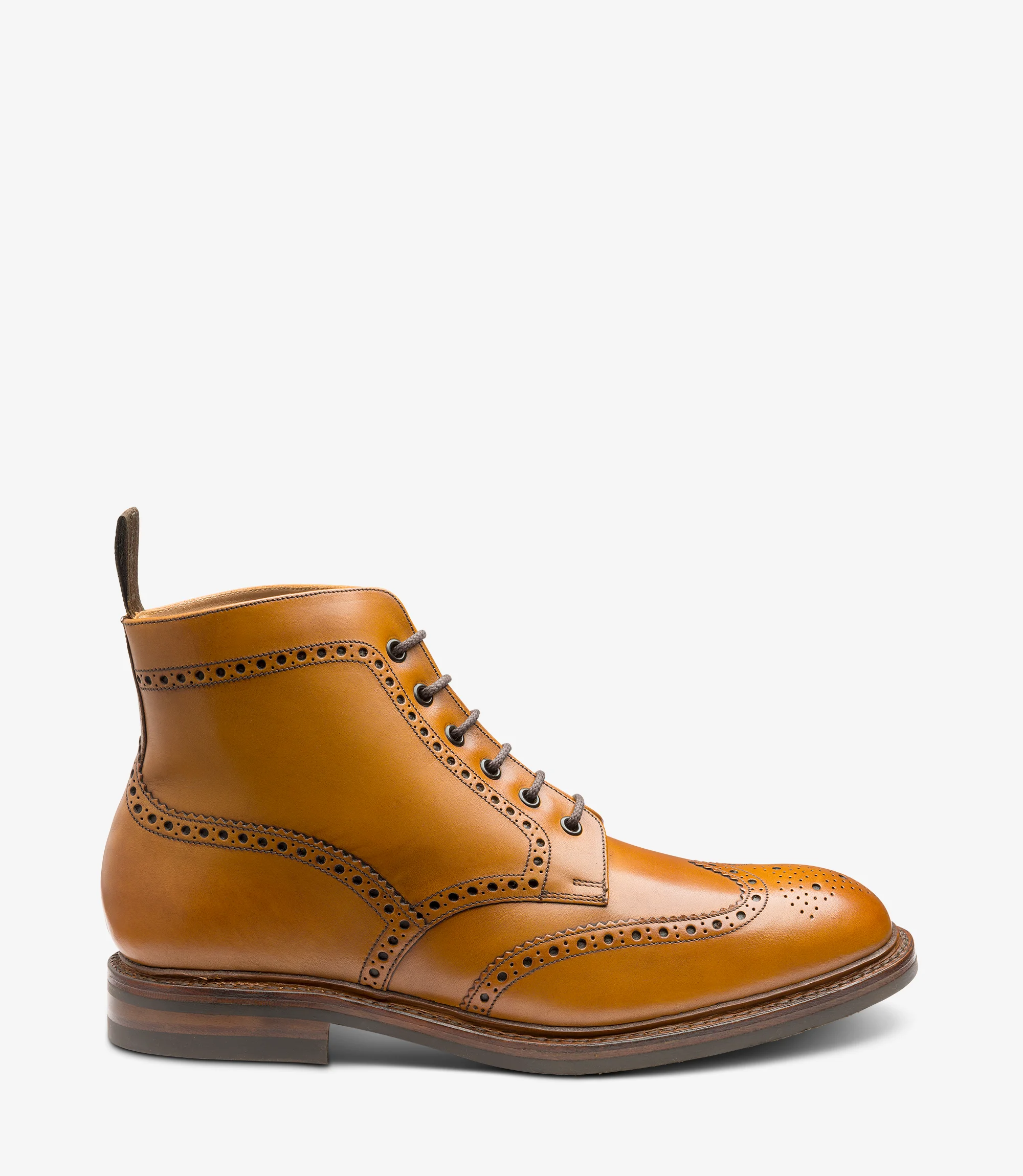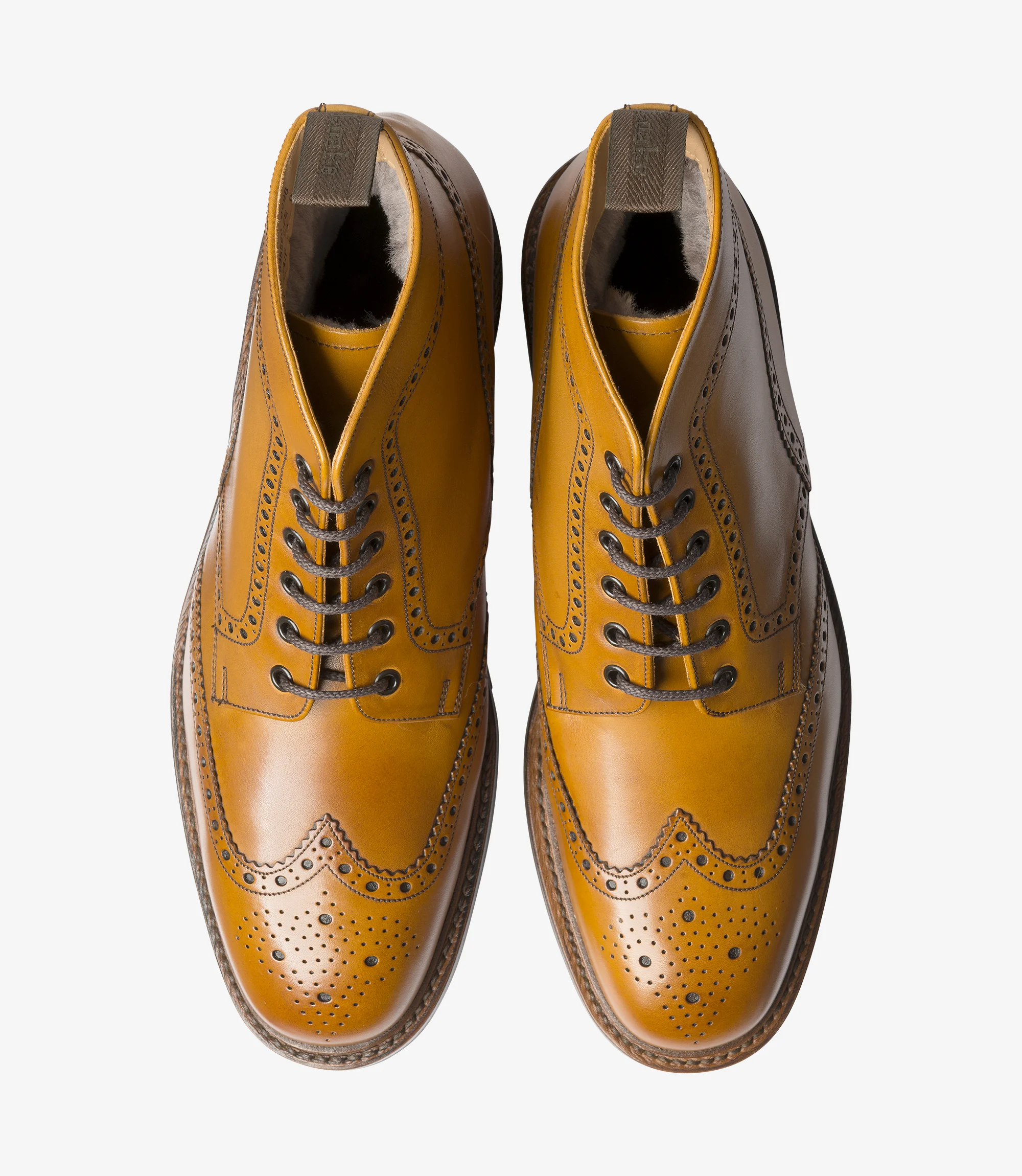 Our Wolf is a premium tan brogue boot, fully lined with genuine sheepskin for exceptional warmth and comfort. Designed with colder months in mind, this boot combines traditional brogue detailing with a rugged yet refined profile. A durable rubber studded sole provides excellent grip, longevity, and practicality for winter conditions. Handmade in our high-grade factory in Northamptonshire, England, Wolf showcases Loake’s commitment to quality craftsmanship and functional style. These men’s shoes are crafted to keep you warm while maintaining an elegant appearance, making them the perfect blend of heritage shoemaking and seasonal performance.